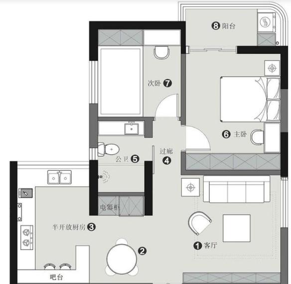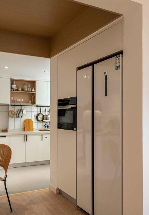 平面布局基本保留了原有功能。为了提高餐厅的亮度和空间利用率,将副阳台的面积带入厨房,抵消卫生间的隔墙,餐厅增加了电动储物柜。一个好的空间重塑可以给生活带来很多便利,哪怕只是移动35厘米的墙。
