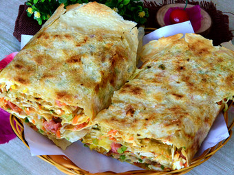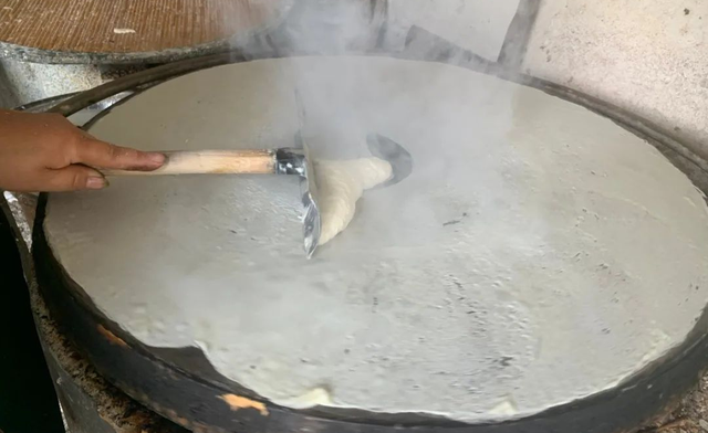 手工煎饼是北方的传统美食。它以红薯面、小麦面粉、玉米面等为原料搅成浓糊状,上热鏊摊烙而成。