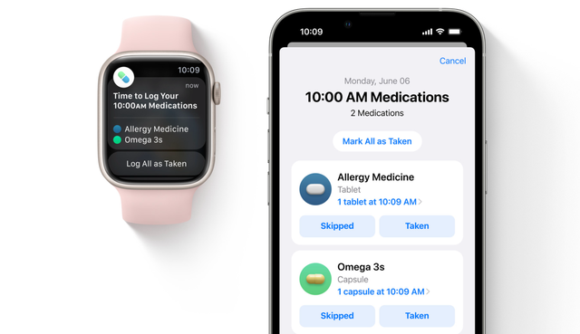 还有watchOS 9新增的用药App,帮助TA设置好用药时间,提醒TA按时吃维生素和营养品,这也太贴心了吧!