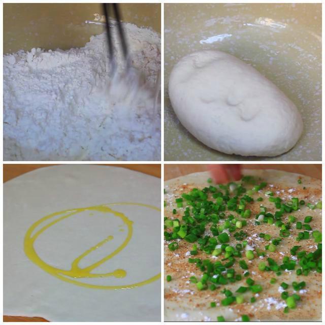 第三步,然后我们在饼上倒些油,给它抹均匀,接着撒上椒盐粉,没有椒盐粉的话也可以撒上五香粉,再撒上一些干面粉,这样层次好,然后把葱花均匀的撒上表面,从一边慢慢的卷起来,收口处捏紧一些,接着再把饼卷起来,卷好后按压成饼,做好后盖上保鲜膜松弛上5分钟。