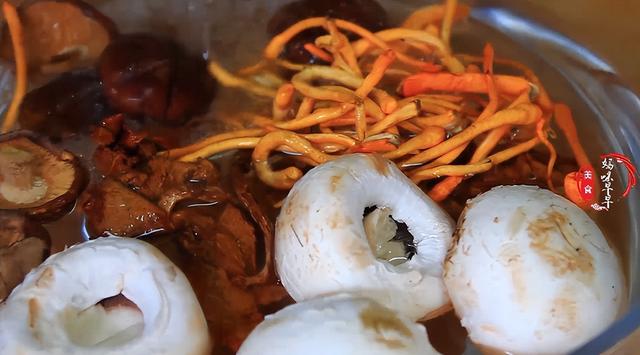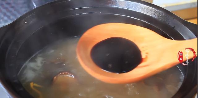 3,时间到了后,咱们打开盖子,哇,汤的鲜味太浓郁了,加入几颗冰糖,一点儿生抽,盐可以多来一些,因为一会儿要浇汤,放少了味道会很淡,搅拌均匀后关火,让菌汤沉淀一下,接着咱们再煮面条。