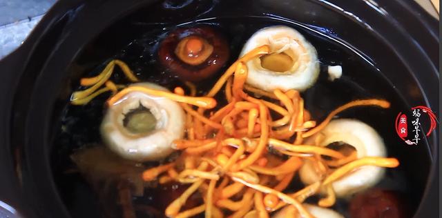 2,砂锅里面倒入适量油,油热后放入口蘑小火慢煎,把口蘑的汁水煎出来,这样汤味更鲜,然后倒入泡好的茶树菇和水,水一次性加足,再加入虫草花,搅拌均匀,盖上盖子先大火煮开,然后转小火慢炖1个半小时。