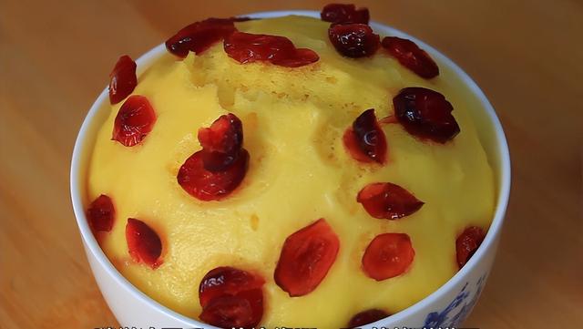 5,准备几个小碗,碗里刷上一层玉米油,将面糊舀入碗里面,用工具将表面稍微整理平整。接着撒上蔓越莓干。盖上保鲜膜继续二次醒发15分钟。