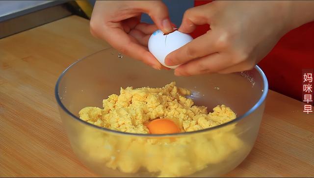 2,搅拌成面疙瘩后,加入3克的酵母,再加入适量白糖,喜欢吃甜的,糖可以多加一些。然后在打入两个鸡蛋,将玉米面搅拌至顺滑无颗粒。