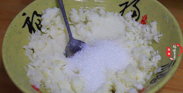 5、蒸熟的山药将它压成泥,然后放入适量的白糖增加甜度。