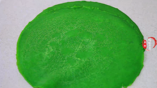 4、平底锅里刷上薄薄的一层油,油热后倒入一勺的菠菜粉浆,将它摊成圆饼,稍微薄一些,差不多2分钟就能摊一个,全部摊好后装盘备用。
