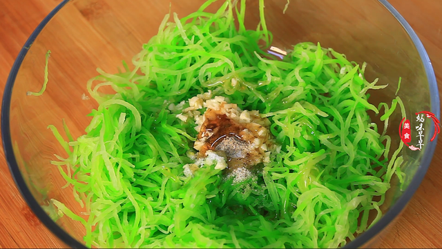 4、萝卜丝沥干水分后放入盆里,然后将它们全部抖散开,加入一勺蒜末,一勺盐,一点味精,适量的胡椒粉,再淋入一些香油,然后将它们搅拌均匀。