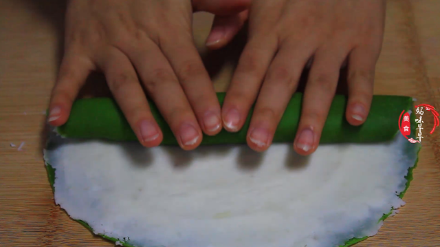 6、菠菜饼铺到案板上,然后均匀的抹上山药泥,从一头慢慢地卷起来,卷得要紧一些。