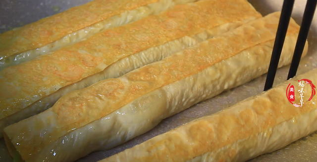 6,最后卷起来就可以上锅煎了,平底锅里倒油,然后用刷子刷均匀,油热后放入豆皮卷,中小火慢煎,用筷子轻轻拨动一下,让它受热均匀,底部金黄后给它翻个面,注意别烫到手了,一直煎到四面金黄就可以出锅了。