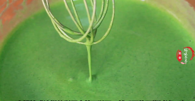 3、过滤好的菠菜汁差不多200克左右,然后打入几个鸡蛋,分次加入100克面粉,将它搅拌成没有颗粒。