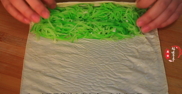 5、泡好的油豆皮铺到案板上,给它改一下刀,具体大小根据自家的平底锅而定,在一头放上拌好的萝卜丝,从一头慢慢地将它卷起来,卷的稍微紧一些,留一个边,把刚才准备的鸡蛋液刷上,这样能更好地粘合。