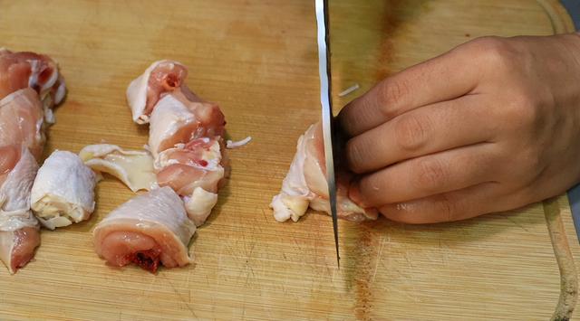 1、准备鸡腿适量,洗净后切成小块,注意不要剁得太大,鸡腿会不入味,但是也不能太小,炒至后肉质缩小,没有嚼头。