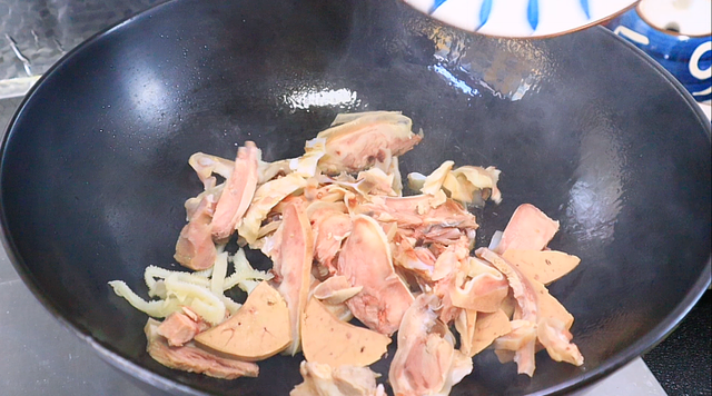 2、捞出羊杂清洗干净,锅烧热放入羊油,然后倒入羊杂翻炒,这一步是增加羊杂的香味,另外一个关键点就是汤色奶白。