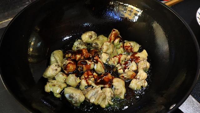 5、锅中留油,然后倒入鸡块大火翻炒,同样也把表面炒到微微金黄,加酱油、生抽、蚝油、白糖、食盐、少许的清水,把调料的香味炒出来。多炒几下,让酱料的香味完全可以散发出来。