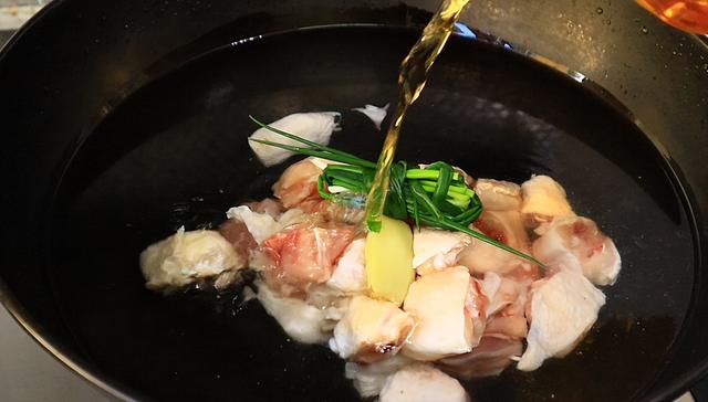 2、锅中加入适量清水,鸡腿记住要冷水下锅,加入葱姜、料酒去腥,有条件的加2个八角,这样焯出的鸡肉没有腥味,还特别香,大火把血沫煮出来。