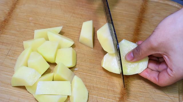 3、趁着焯水的时间,准备一个土豆去皮切成小块,鸡肉搭配土豆还是非常好吃的,切好后装盘备用。