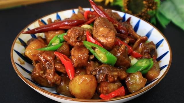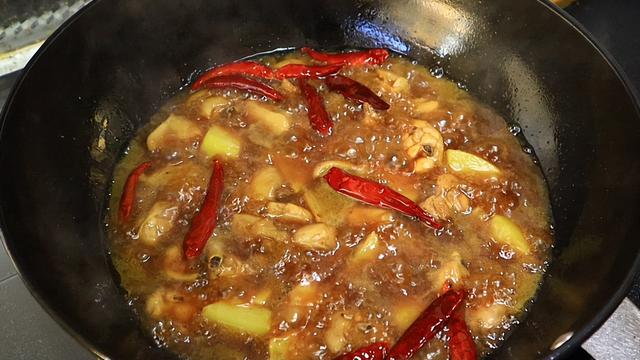 6、接着倒入开水,没过鸡肉,放入煎好的土豆,家里条件好的,可以加点啤酒,盖上锅盖煮20分钟。
