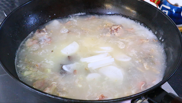 4、大火把汤汁煮开,煮开后下羊血、白萝卜,煮上个几分钟,然后在下饼丝、粉丝煮熟。