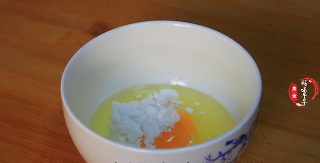 3,准备两张油豆皮,放入清水里浸泡变软,碗里打入一个鸡蛋,加一勺淀粉搅拌均匀,后面要用到。