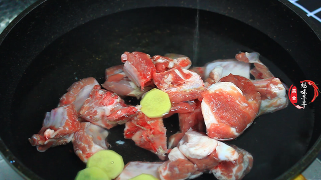 5、砂锅里倒入排骨,加几片生姜,一次性加入足量的清水,盖上锅盖大火煮开。