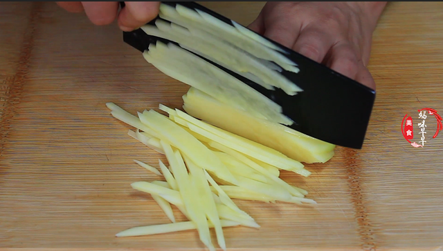 1、去皮的土豆先切一刀,给它切出一个平面,这样切片的时候就比较容易,,把土豆切成均匀的薄片,然后再切成细丝,不要太细,也不要太粗,差不多像火柴棍般粗细即可。