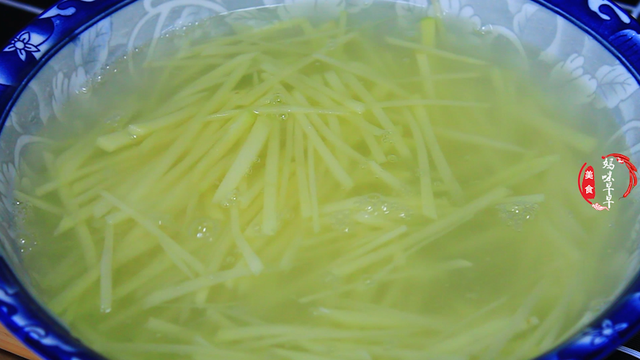 2、切好后放入清水里面,加一勺白醋,这样土豆不会氧化,口感也清脆,泡上一会儿,把土豆多余淀粉浸泡出来。