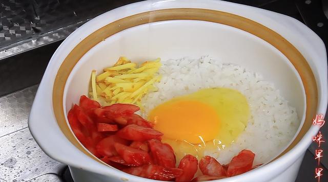 5,米饭快熟时加入香肠,姜丝,再打一个鸡蛋,小火5分钟,时间到了后关火再焖10分钟。