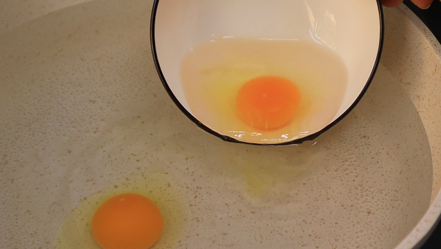 2、将小碗贴近水面,然后慢慢倒入鸡蛋,不要开火,利用水的温度先把鸡蛋定型。然后盖上锅盖煮2分钟即可。