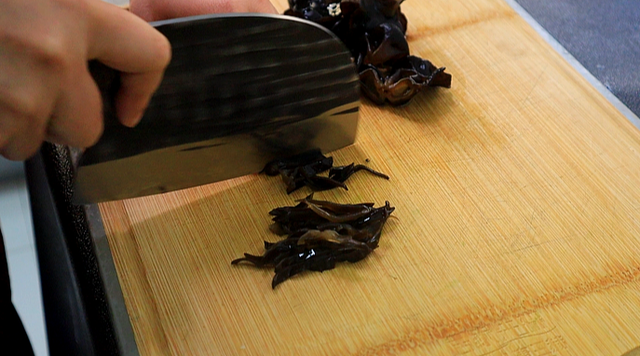 2、锅中水开后放入蒸锅,大火蒸5分钟,接着准备一些泡发好的木耳,切成细丝备用。