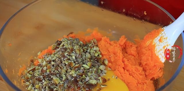 2,蒸好的红薯放入一个大盆子里,然后捣成泥,加入一个蛋黄,一勺白糖,倒入板栗末,10克左右的玉米油,将它们完全搅拌均匀。