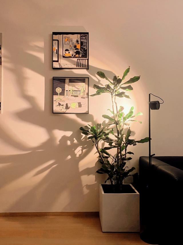 黑色直排沙发靠墙摆放,为两边的绿色植物留出空间,为家里增添了清新的气息。。