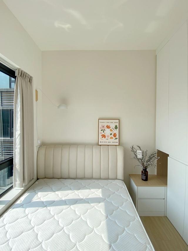 床头设计了一个柔软的包,靠在上面很舒服。以床头的厚度,刚好够放一幅装饰画,比挂在墙上更有艺术感。