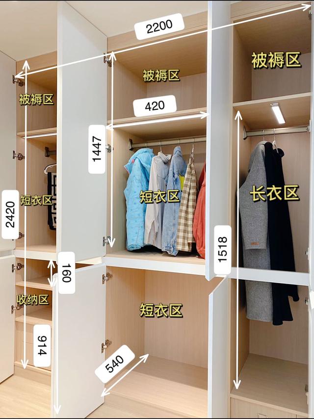 橱柜空间的设计主要以衣服挂区为主,分为短衣区和长衣区。衣服直接挂起来,一眼就拿出来了。