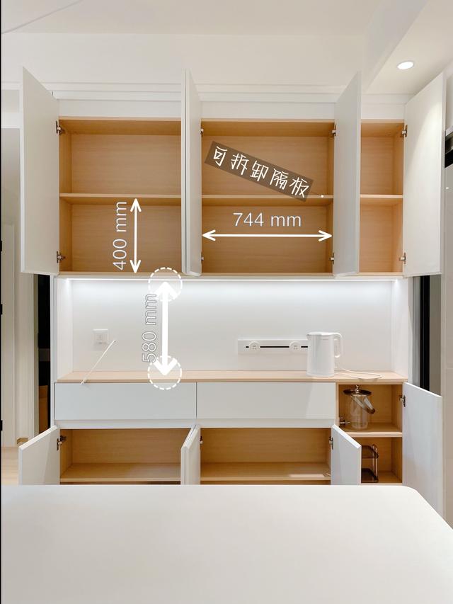 上下两部分都配有白色柜门,中间留了58cm的空间做了一个小吧台,并预留了灯条和轨道插座。