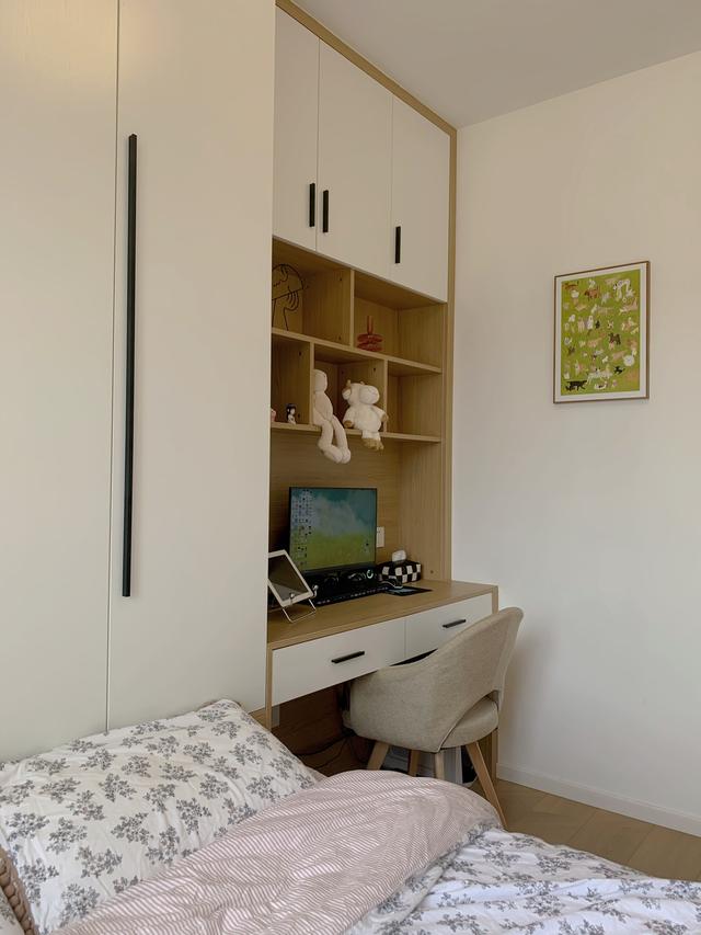 在第二间卧室放置好床,定制好衣柜后,剩下的空间就不多了。在床头的左边有一个角落的桌子。透明的玻璃桌面,不锈钢支架,视觉上轻盈美观。。
