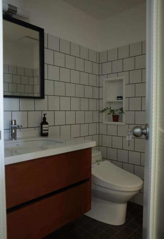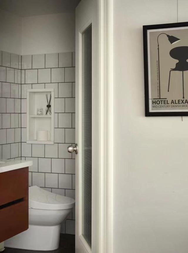 壁龛是利用下水道的出入口做的,刚好可以放置香薰和纸巾,超级实用又美观。