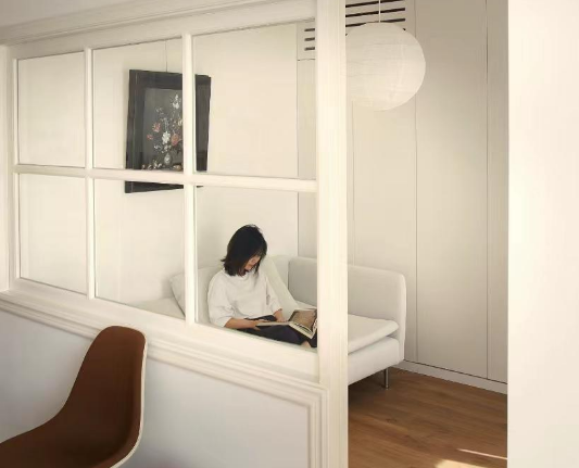 次卧与客厅之间采用玻璃窗隔断设计后,通透感十足。平时用作书房和储物空间,亲友来访时也可用作卧室。