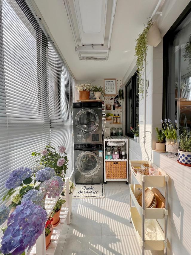 客餐厅外连接休闲阳台,由储物柜和晾衣区组成,顶部安装智能升降衣架,可收纳洗衣机和烘干机,配备洞洞板。