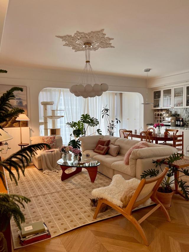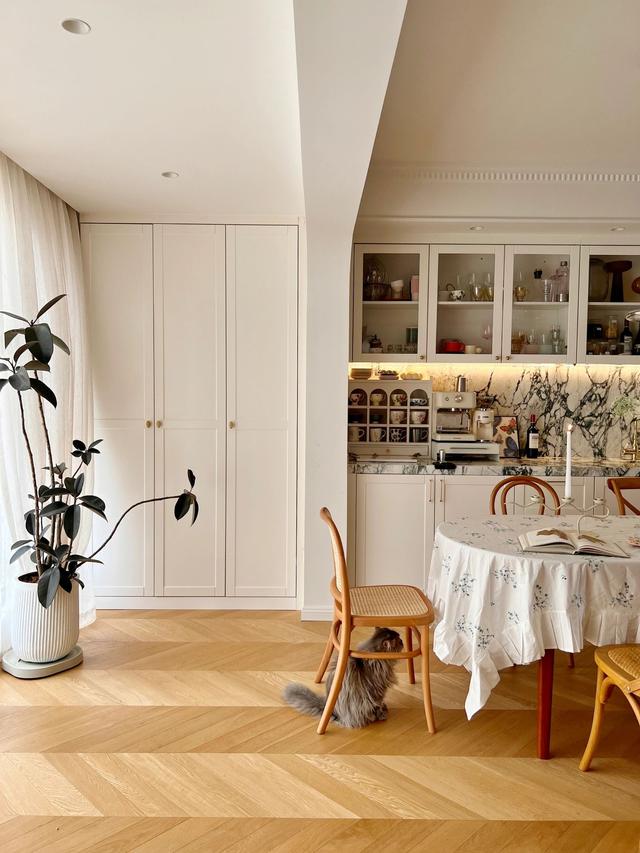 以奶油白色为基调,地面铺设木地板,采用深木色家具,搭配石膏线背景墙,打造轻法式风。
