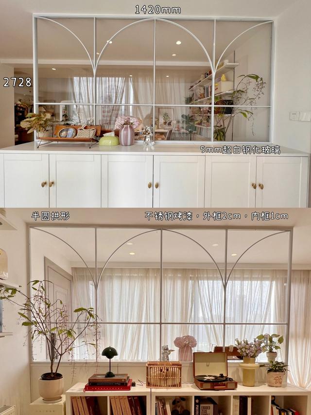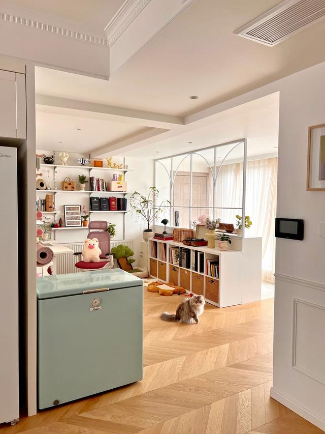 建筑面积约149㎡的房子,入户后是开发商赠送的“入户花园”,业主将此部分空间改造成开放式书房,并在书房与玄关之间设计了“玻璃+柜子”隔断。