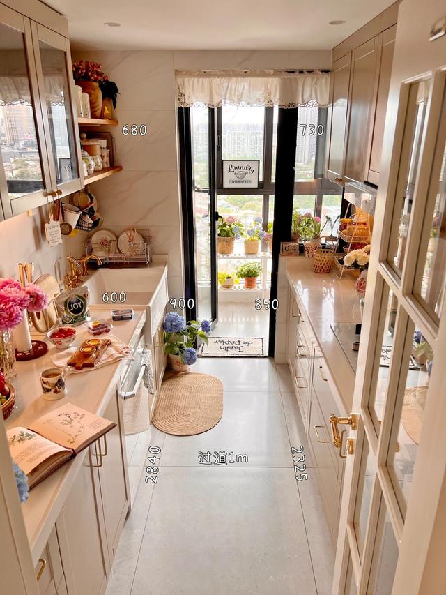 中间留出1m宽的过道空间,采用高低台设计,橱柜为多层实木板柜门,取消吊柜设计增加收纳,避免了拥挤感。。