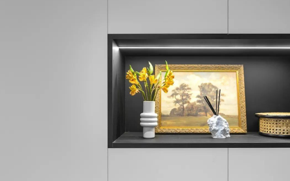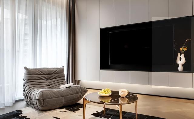 客厅有两点值得注意。一个是天花板,没有主灯直接平掉,一个是电视墙。底部的整体