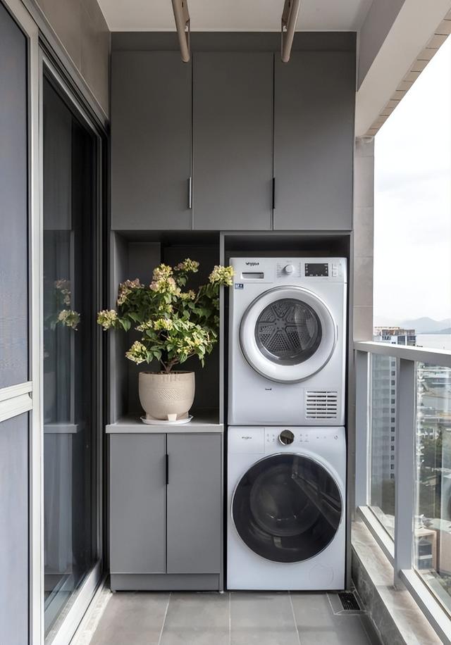 橱柜内嵌叠放的洗衣机和烘干机,收纳杂物的橱柜本身无疑兼具美观和实用的双重属性。