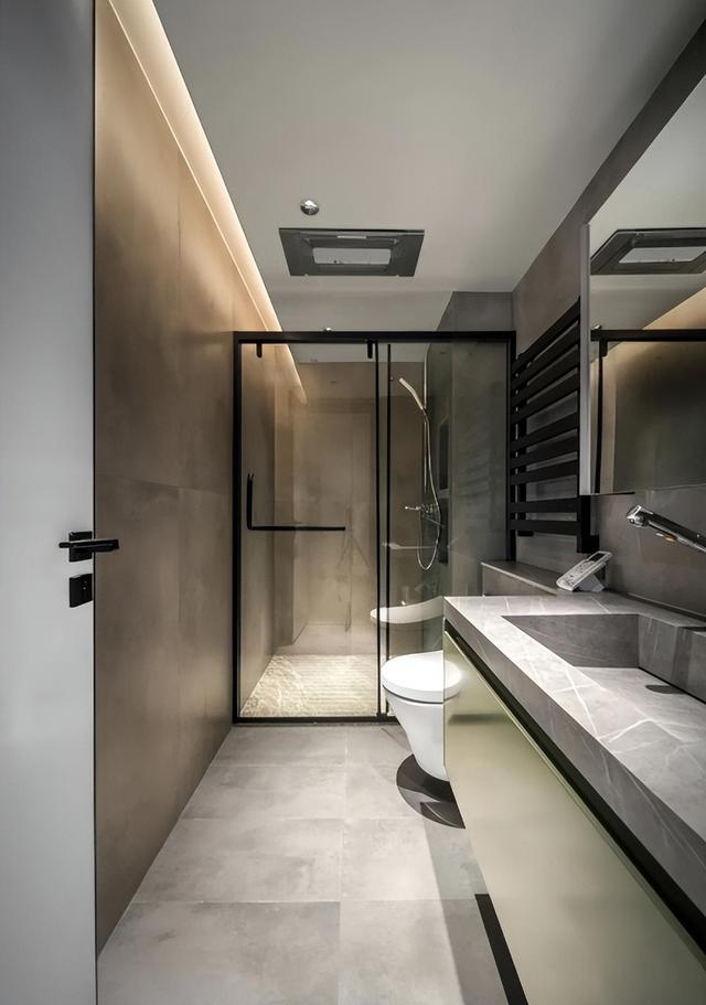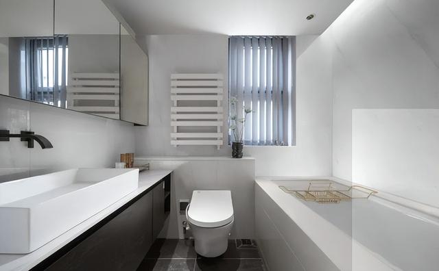 包括客卫和主卫。效果时尚又干净。值得一提的是,马桶是壁挂式结构。不仅方便卫生,而且颜值高。