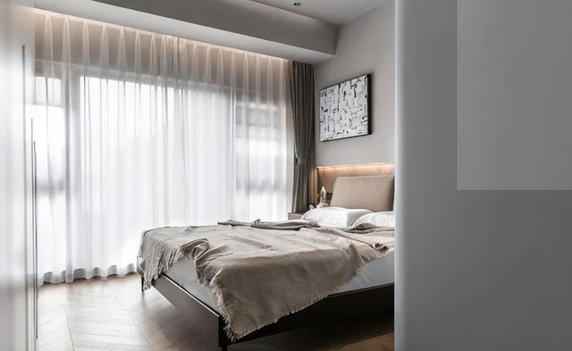 和之前的效果差不多。不同的是主卧自带大面积落地窗,为房间提供充足的采光和开阔的视野。虽然床头墙只刷了漆,但是下半部分的木质墙板还是不错的。