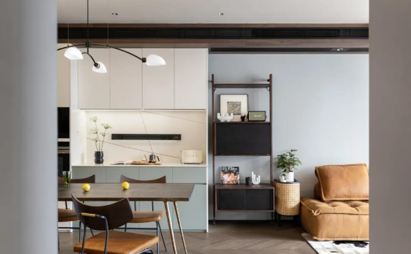 餐厅沿着玄关延伸进来。在装修上,不得不说整体氛围不错,干净的效果令人赏心悦目。比如在左边的餐厅背景墙,特别清爽。至于提前定制的大柜,不仅嵌入冰箱,还解决了餐厅的收纳。该桌子可搭配水槽和导轨插座使用。可以做西餐厨房和水吧。可以提高生活的便利性和幸福感。