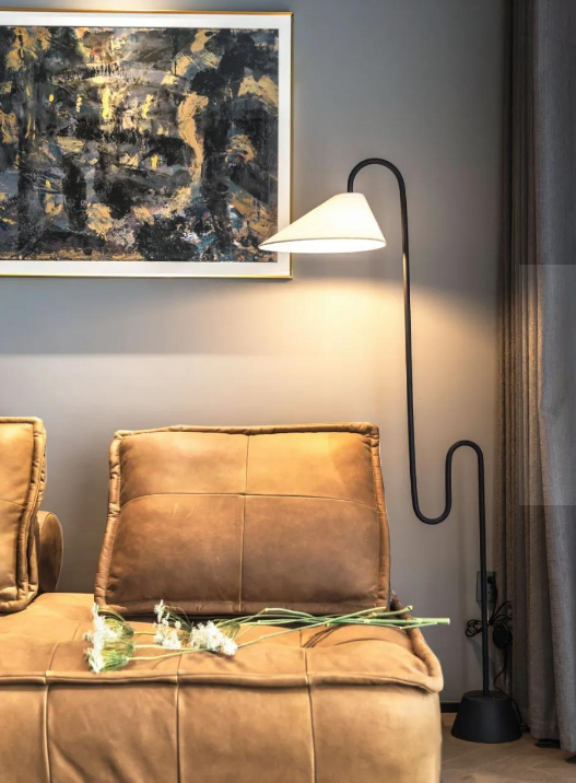 橱柜是定制的。藏式的,达到井井有条的效果和尘垢的效果,也能显得美观实用,便于清洁和管理。而这也是设计师和女主角的方面。另一面是沙发墙,延续了之前的风格,乳胶漆干净清爽。区别在于避免单调。这是装饰画。家具方面,沙发,座椅,茶几,落地灯都不错。