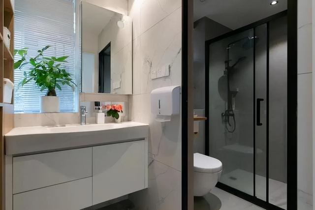 浴室内饰配色为黑色和灰色的经典组合,以黑框玻璃作为隔断,视觉感干净清爽。壁挂式马桶设计减少了卫生死角。