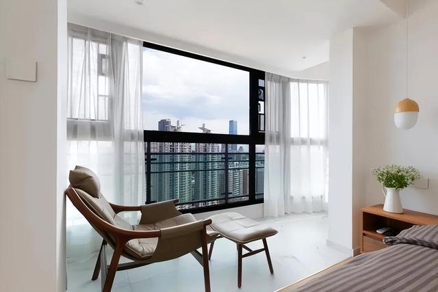 主卧最大亮点是拥有自己的观景阳台。设计师将阳台纳入卧室,摆放了一组休闲椅,让其成为一个放松的空间,提升生活心情。