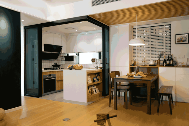 2. 拆除厨房的非承重墙,换成双面玻璃推拉门,打开后可隐藏在墙内。